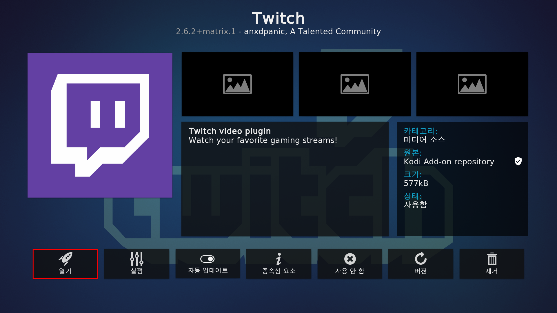 여러가지 애드온이 있지만 대중적 인터넷 방송인 트위치를 설치하고 실행해 보겠습니다.