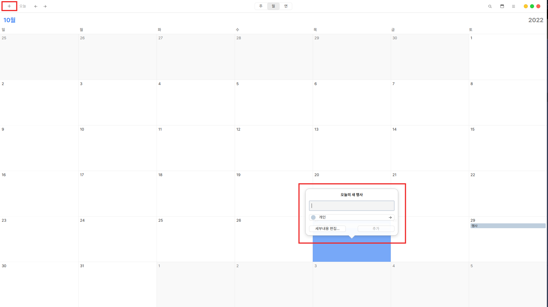 화면 상단의 + 버튼을 클릭하거나 일정 추가가 필요한 날짜에 마우스 우클릭을 통해 일정을 추가할 수 있습니다.