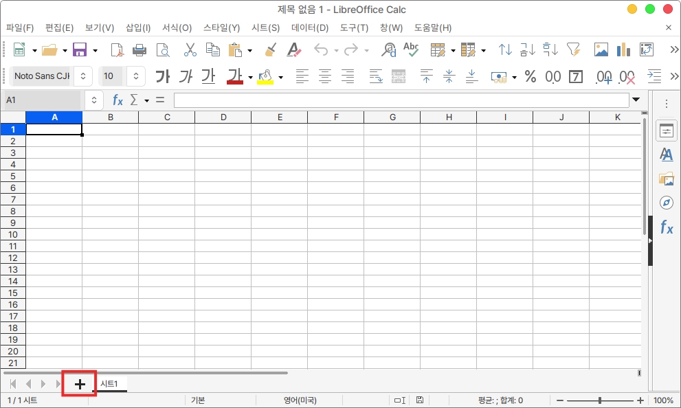 새 워크 시트를 기존 워크시트의 끝에 빠르게 삽입하려면 화면 맨 아래의 워크시트 삽입 탭을 클릭합니다.