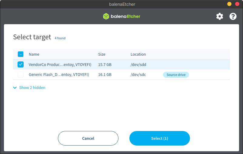 select target버튼을 클릭해서 이미지를 설치할 SD카드 또는 USB 선택 후 select 버튼을 눌러줍니다.&#x20;