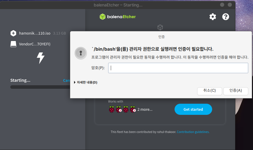 Flash 버튼을 누르고 로그인한 계정의 비밀번호를 입력하면 굽기가 진행됩니다.&#x20;