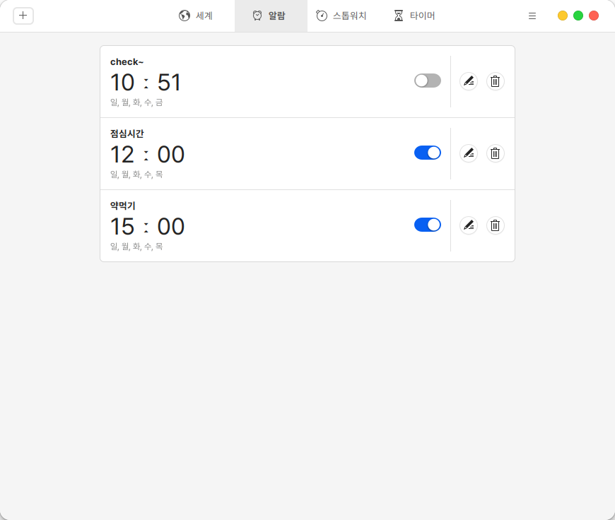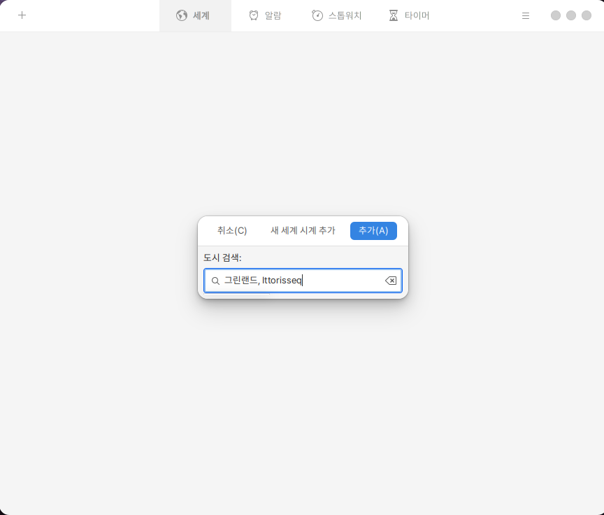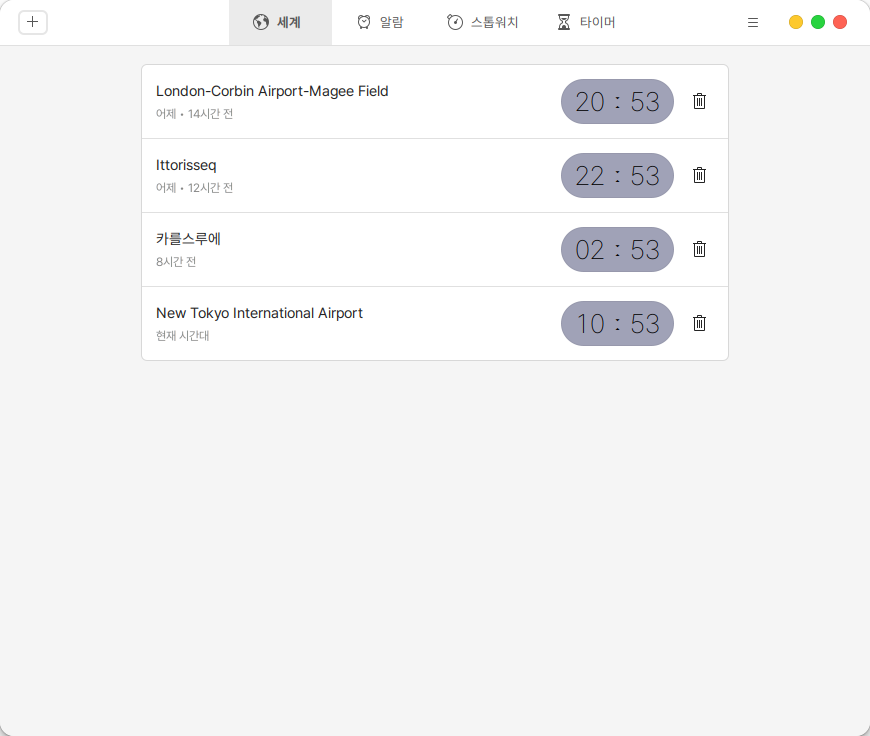 화면 좌측 좌측 상단의 ![](https://content.gitbook.com/content/C315WC6dRVJep7HW9qDc/blobs/cZDku3QiywQ53f386CzF/%EC%8A%A4%ED%81%AC%EB%A6%B0%EC%83%B7,%202022-11-17%2010-49-35.png)아이콘을 클릭하면 원하는 나라의 시간을 추가할 수 있습니다.&#x20;