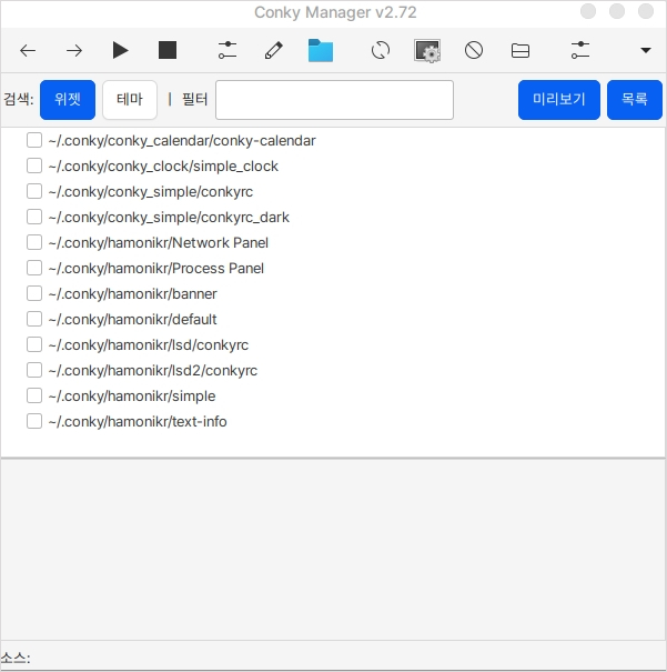 Conky의 온/오프 기능은 Conky Manager에 체크되어 바탕화면에 표시된 위젯을 켜거나 끌 수 있습니다.