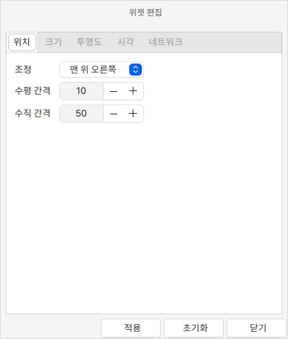 위젯 편집창에서는 위젯의 위치, 크기, 투명도, 시간, 네트워크 설정을 변경하실 수 있습니다.