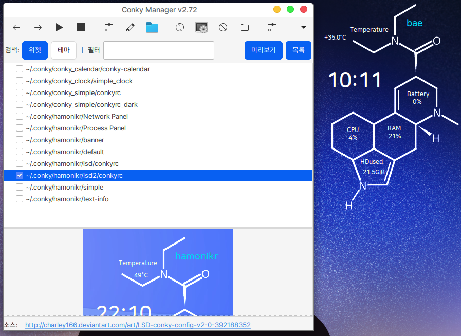 아래와 같이 `Conky 설정도구`에 해당 테마가 추가된 것을 확인할 수 있습니다.