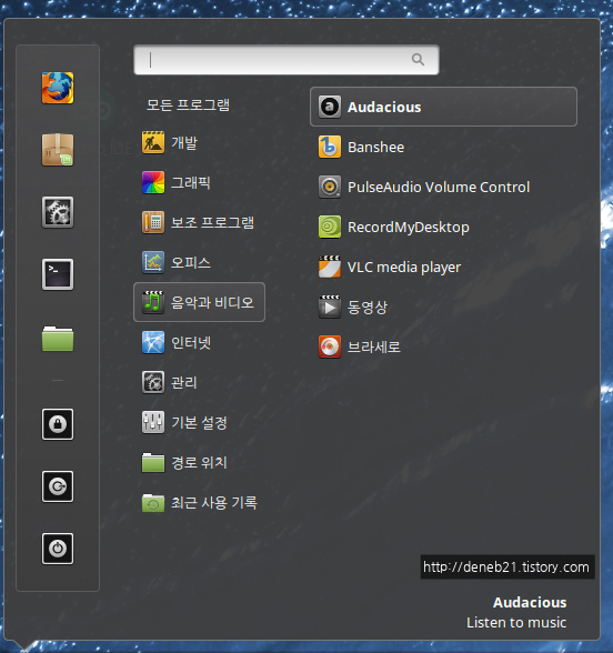 메뉴 버튼을 눌러보면 '음악과 비디오' 카테고리에 Audacious' 라고 설치가 되어 있습니다. 클릭해서 실행해 봅니다.