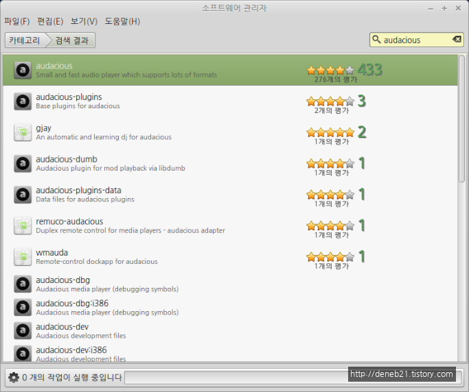 소프트웨어 관리자에서 audacious 를 검색 합니다. 맨 위에 audacious 가 나옵니다. 더블클릭해서 들어갑니다.