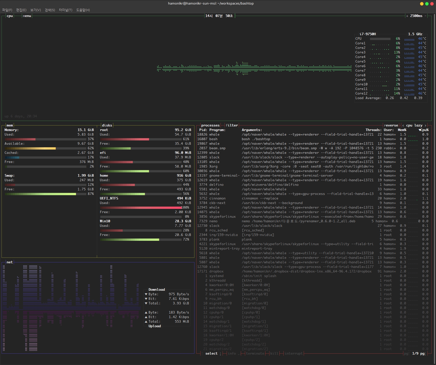 htop 도 좋지만 보다 시각적인 효과를 추가한 터미널용 모니터링 프로그램이 있는데 아래 링크의 bashtop 입니다.