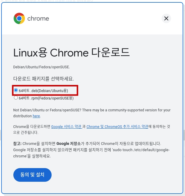"64비트 .deb (debian/Ubuntu용)"항목에 체크하고 동의 및 설치 버튼을 누르면 설치파일 다운로드가 진행됩니다.