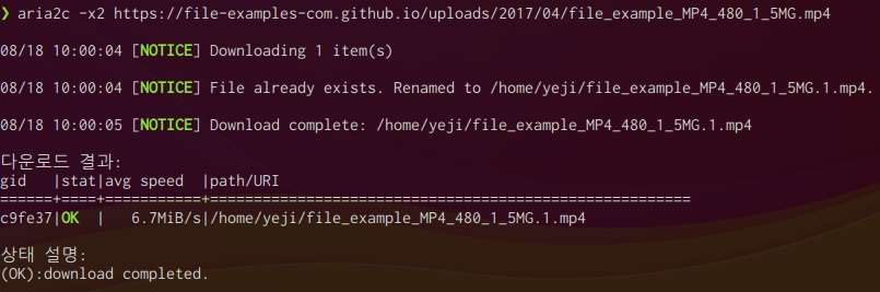 아래와 같이 -x 옵션을 통해 여러개 커넥션으로 하나의 파일을 다운로드 받을 수도 있습니다.