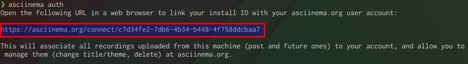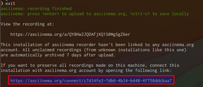 영상을 영구적으로 보관하고자 한다면 asciinema.org에 가입해야 합니다.