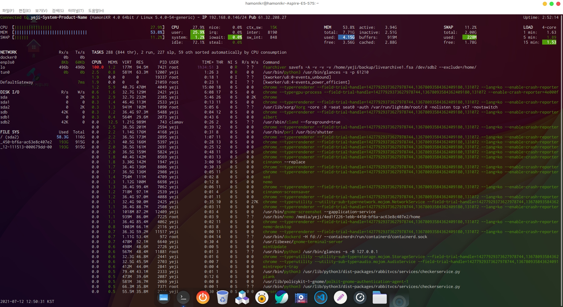 다른 PC에서 터미널 창을 열고, glances -c [대상 PC의 IP]