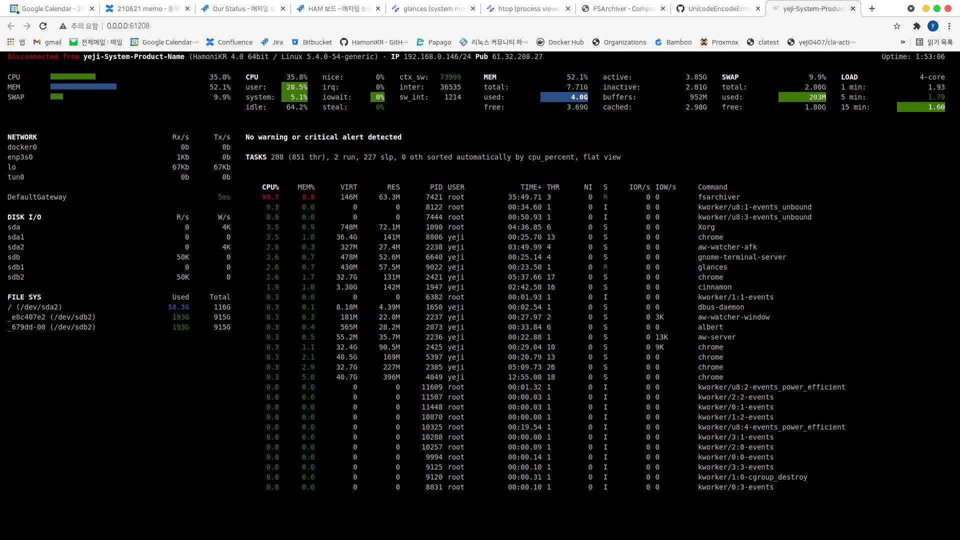 위에서 출력된 주소인 http://0.0.0.0:61208 에 접속하면 아래와 같이 웹으로 로컬 시스템 모니터링 페이지를 볼 수 있습니다.