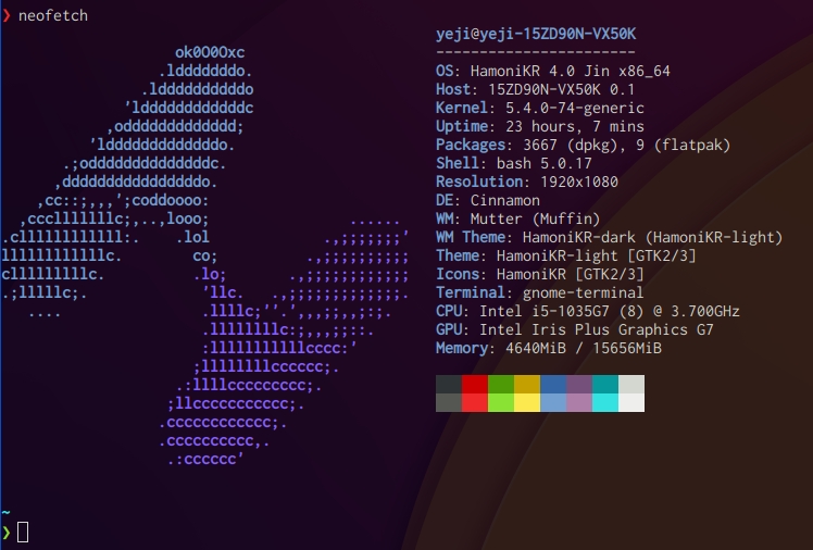 를 입력하면 다음과 같이 좌측엔 하모니카 로고가, 우측엔 시스템 정보가 출력되는 것을 확인할 수 있습니다.