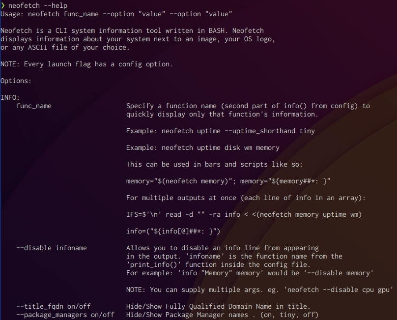 를 입력해 neofetch에 대한 설명과 다양한 옵션을 확인할 수 있습니다.