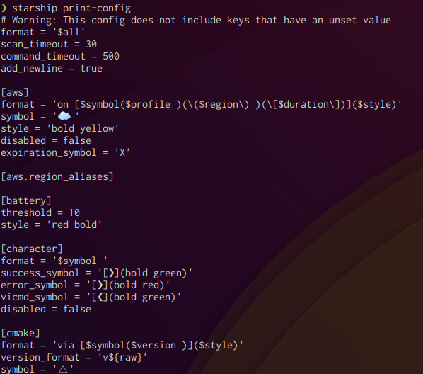 starship print-config 를 입력하면 현재 starship의 설정 정보가 출력됩니다.