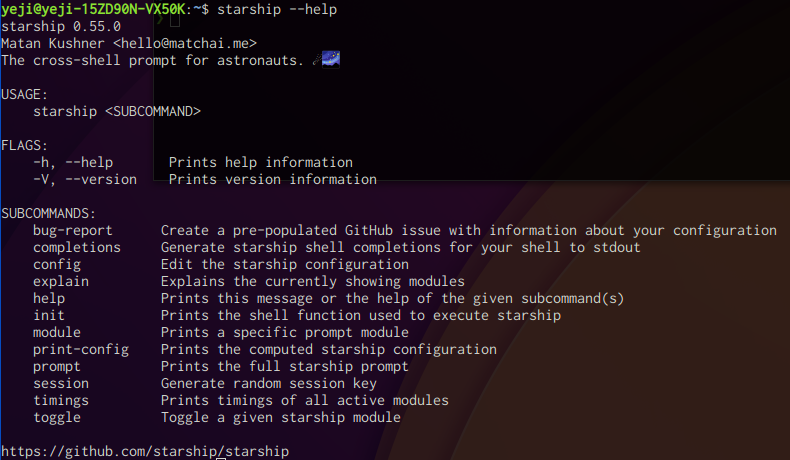 터미널 창에 starship --help 를 입력해 프로그램의 간단한 사용법을 확인할 수 있습니다.