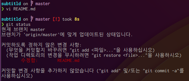 아래와 같이 커밋해야 할 사항이 생길 경우 [!] 로 이를 알리기도 합니다.