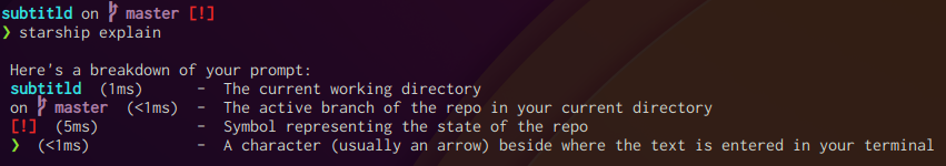 starship이 표시하는 사항이 어떤 의미인지 알고 싶다면 starship explain 을 입력해 해당 정보를 확인할 수도 있습니다.