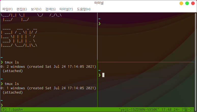 Ctrl+d 키를 누르면 아래 이미지와 같이 현재 pane이 삭제됩니다.