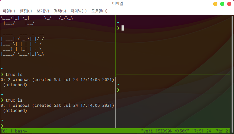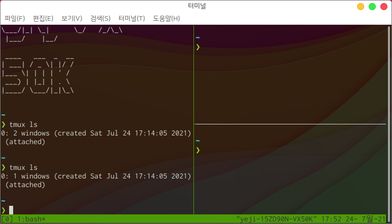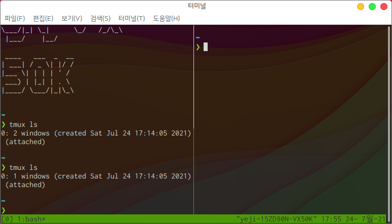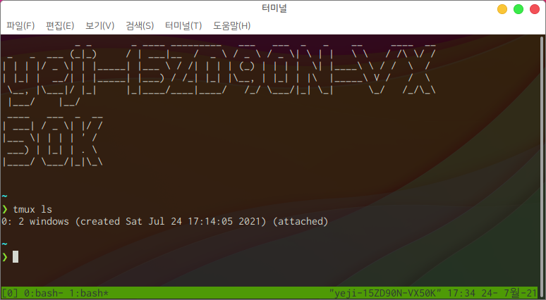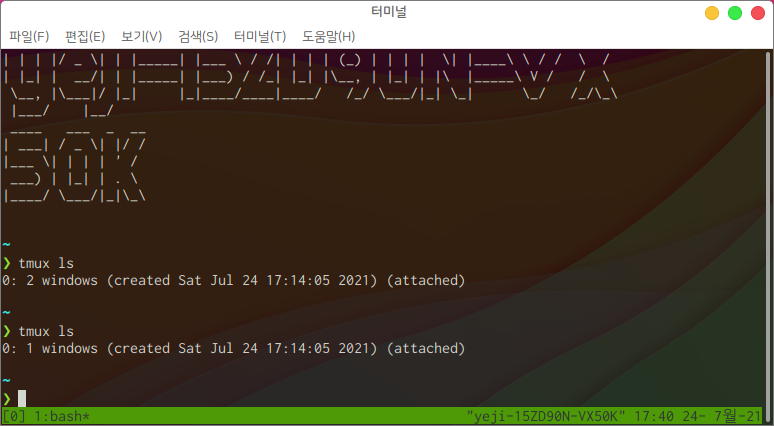 이후 tmux ls를 입력하면 다음과 같이 두개의 윈도우가 존재하는 것을 확인할 수 있습니다.
