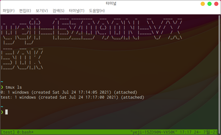 이후 tmux ls를 입력하면 test 세션은 attached 상태가 아닌 것을 확인할 수 있습니다.