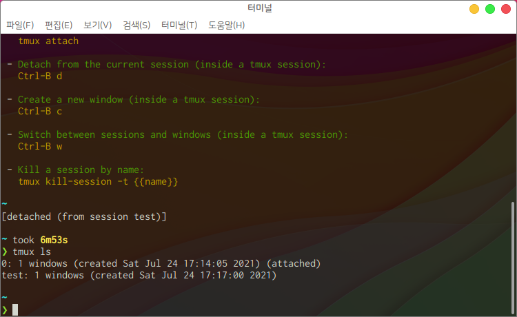 이후, tmux ls 를 입력하면 test 세션이 삭제된 것을 확인할 수 있습니다.