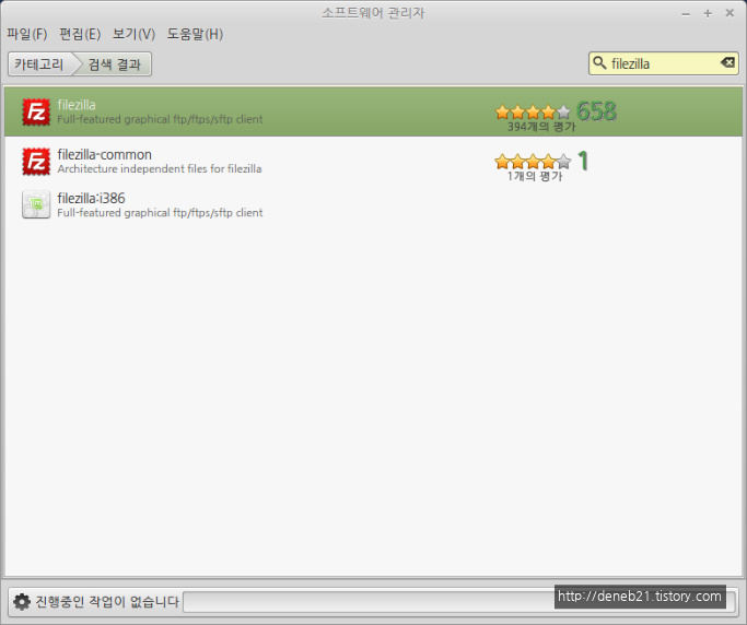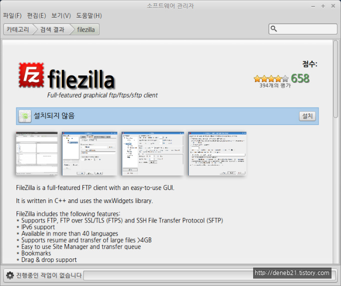 언제나 그렇듯 소프트웨어 관리자부터 시작 합니다. 물론 터미널에서 apt-get 같은 명령어를 이용해서 프로그램을 설치해 주는 것이 리눅스에서는 좀 더 리눅스 다운(?) 방법 이겠지만 저는 이게 더 좋은거 같네요. ^^ FileZilla 를 검색하면 맨 위에 FIleZilla 가 나옵니다. 658건의 다운로드에 별 4개면 꽤 좋은 평가 같습니다.