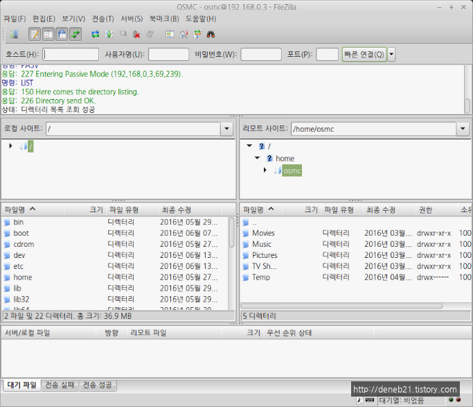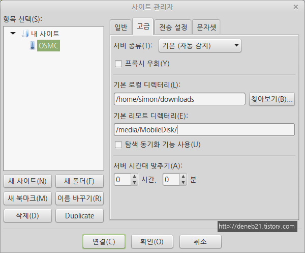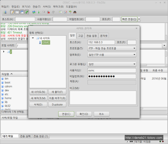 OSMC 서버의 IP를 적고 프로토콜을 FTP로 선택해주고 User ID, Password 등의 접속을 위한 정보를 적어줍니다. 모두 이상 없이 적었으면 '연결' 버튼을 눌러 줍니다.