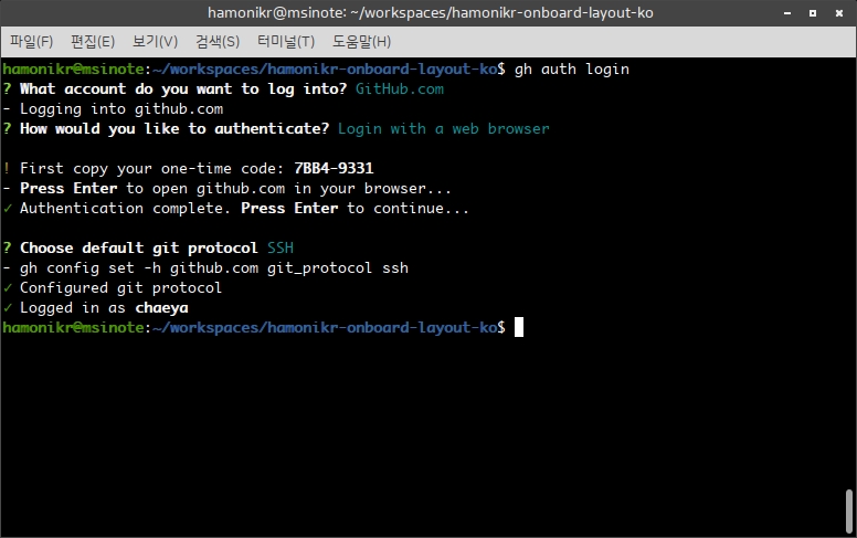 어떤 방식으로 로그인할지 묻는 화면이 나오면 브라우저로 로그인을 선택하고 엔터를 치세요.