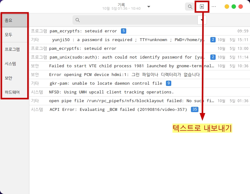 화면 좌측 메뉴를 통해 원하는 로그 확인이 가능하고 상단의 화살표 메뉴를 통해 로그를 텍스트로 내보낼 수 있습니다.
