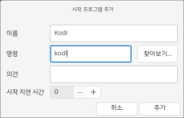 KODI는 기본으로 제공하는 프로그램이므로 다음과 같이 시작 어플리케이션으로 등록합니다.