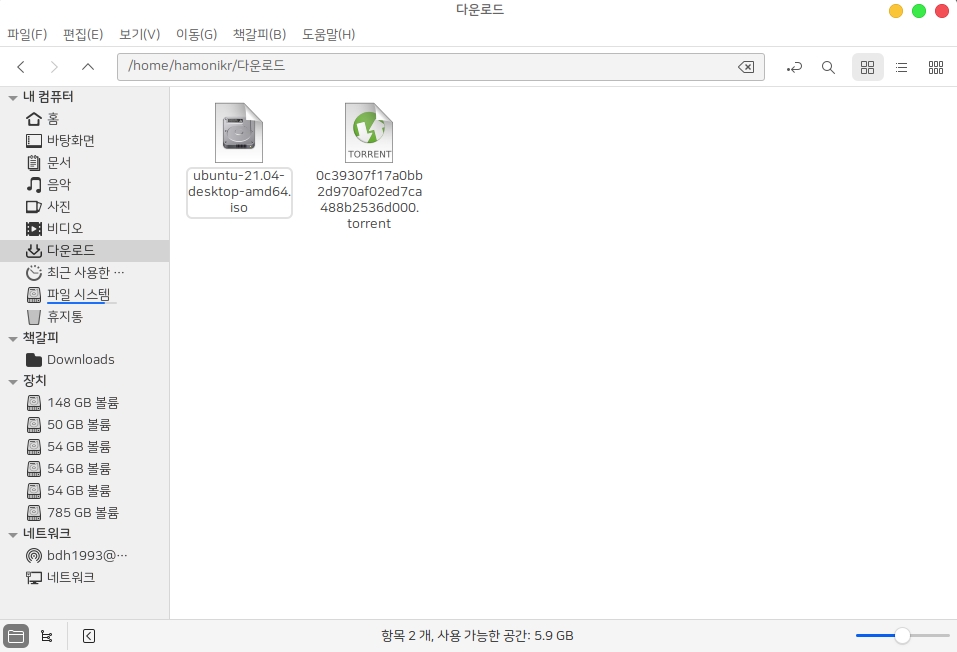 다운로드 위치로 이동하면 다음과 같이 다운로드 받은 파일과 해시코드 이름으로 된 토렌트 파일이 같이 생성됩니다.