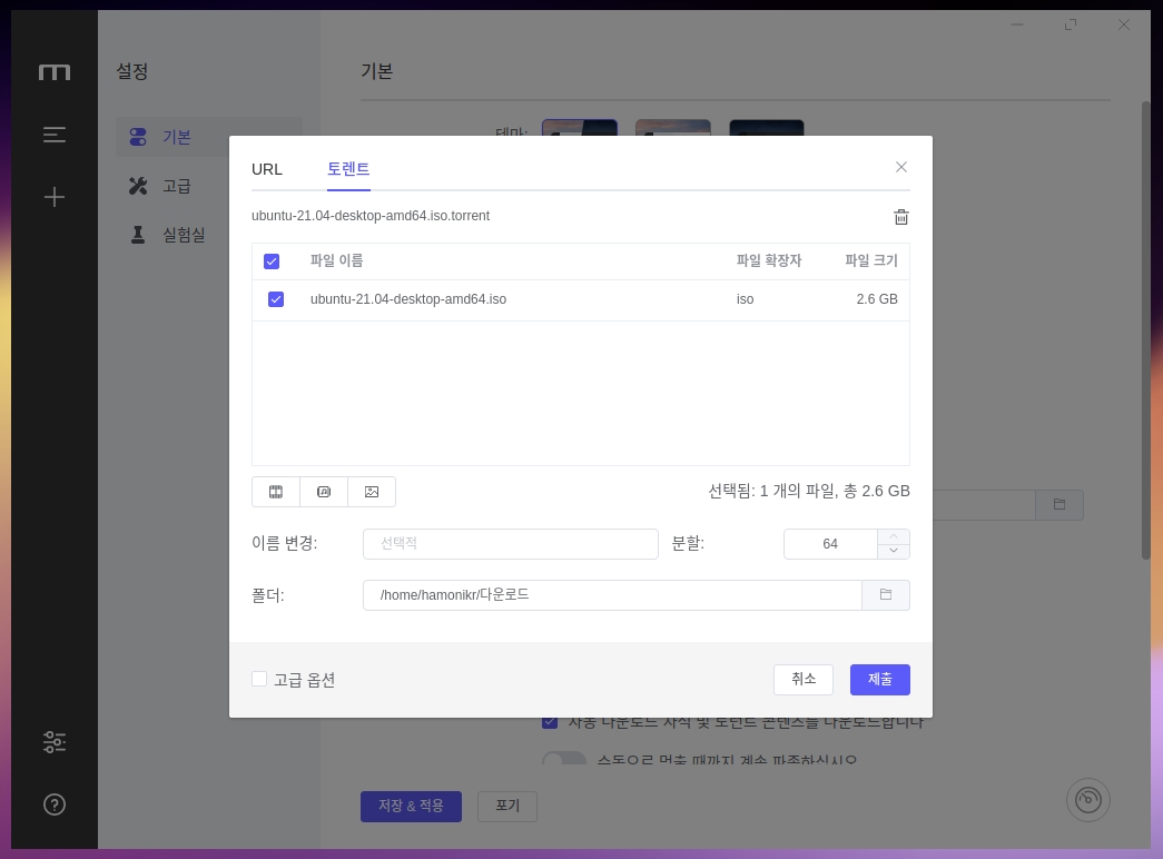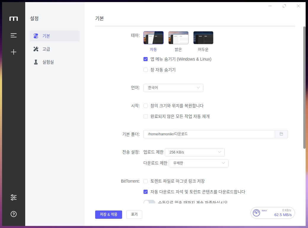 설정을 통해 테마, 다운로드 폴더, 전송 속도 등을 변경할 수 있습니다.