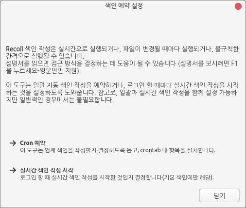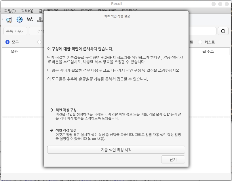 처음 프로그램 설치, 실행시 보여지는 최초 색인 작성 설정