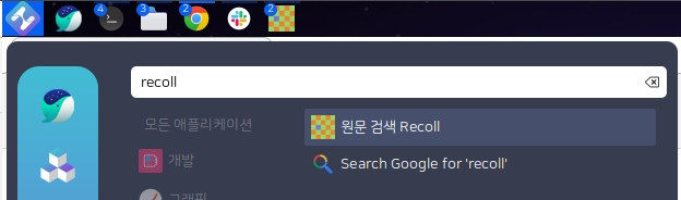 프로그램 설치가 완료되면 시작 메뉴에 recoll 을 검색하여 프로그램을 실행할 수 있습니다.