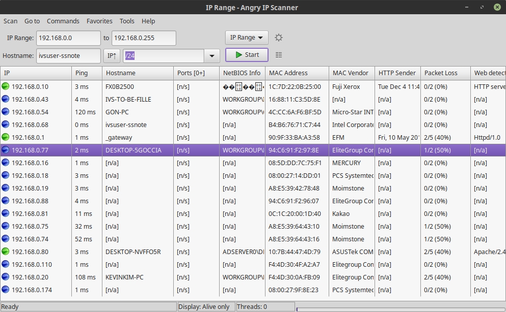 IP Range 에 검색하고 싶은 주소의 대역을 적고 Start 버튼을 누르면 네트워크 스캔의 검색 결과를 확인할 수 있습니다.