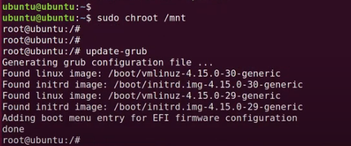 이제 부팅USB가 아닌 하드디스크에서 update-grub 명령으로 부트로더 설정을 업데이트 하기 위해 다음과 같이 입력합니다.