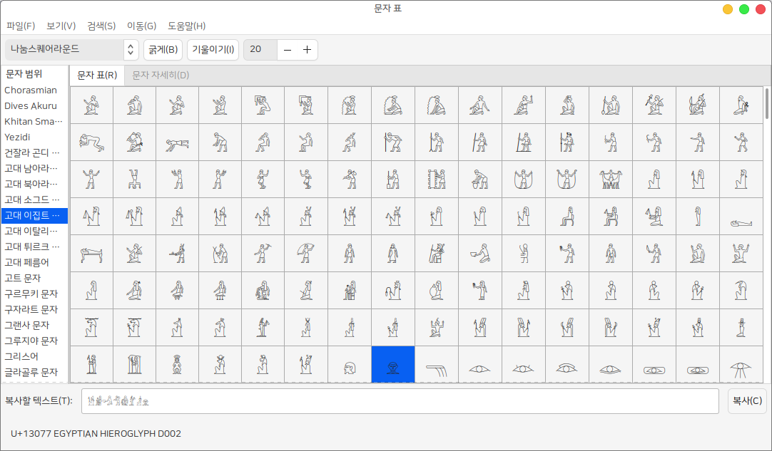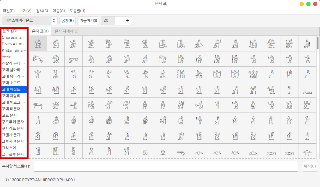 좌측 문자 범위에서 원하는 문자를 선택하면 우측에서 해당 문자의 문자 표 확인이 가능합니다.&#x20;
