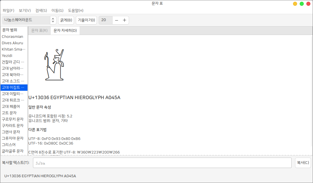 문자표에서 복사할 문를 클릭한 후 화면 상단의 **문자 자세히** 매뉴를 클릭하면 해당 문자를 자세히 확인할 수 있고, 더블클릭하면 화면 하단의 복사할 텍스트에 클릭한 문자가 보여집니다.&#x20;