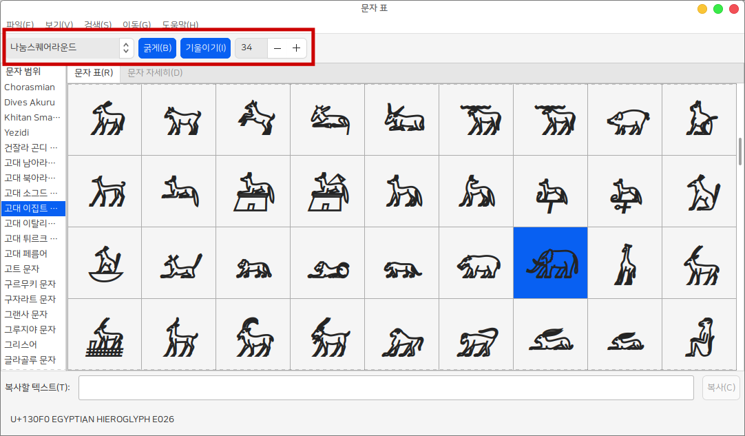 화면 상단의 설정 항목들을 이용해서 문자 표의 문자를 원하는 크기와 모양로 확인할 수 있습니다.&#x20;