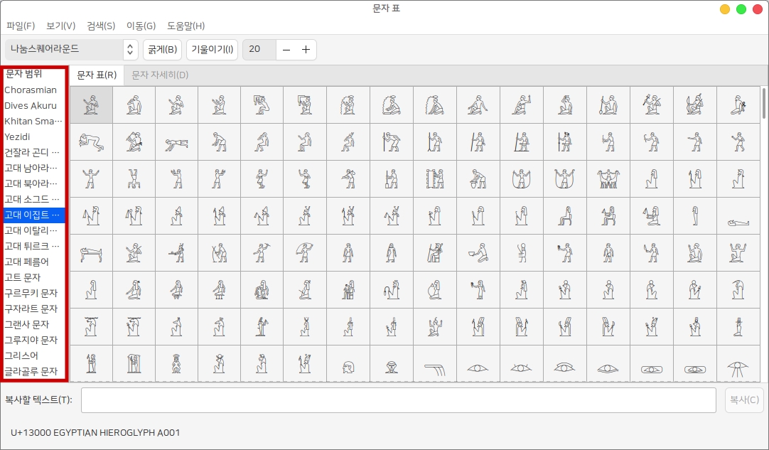 좌측 문자 범위에서 원하는 문자를 선택하면 우측에서 해당 문자의 문자 표 확인이 가능합니다.