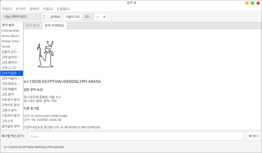 시작메뉴에 문자표를 검색하거나 터미널에 gucharmap를 입력하면 문자 표 실행이 가능합니다.