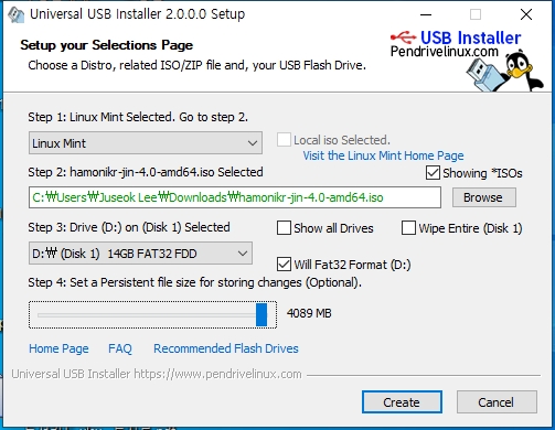 Step3에서 부팅 usb를 지정하고, 마지막으로 Step4에서 Persistent file size를 최대로 설정해 줍니다.